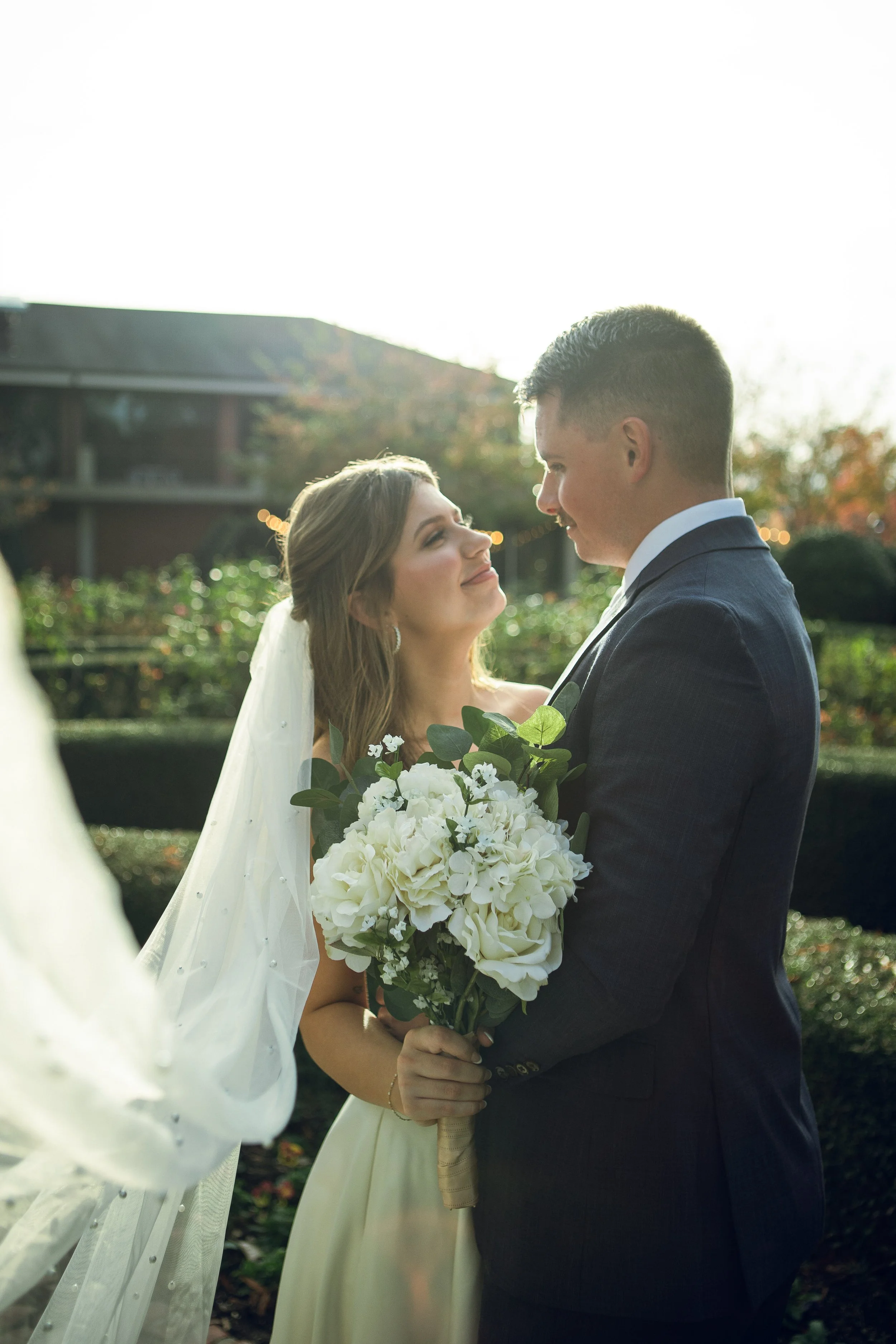 After our time on campus, Kendall and Jussely hopped into their getaway car—a classic 50s Mustang—and headed to downtown Greenville. The vintage car was a perfect complement to their timeless style and added a fun, nostalgic touch to their day. In downtown Greenville, we explored the city’s charming streets and captured more beautiful bridal portraits. The urban setting provided a striking contrast to the natural beauty of the rose garden, giving their gallery a diverse and dynamic feel.